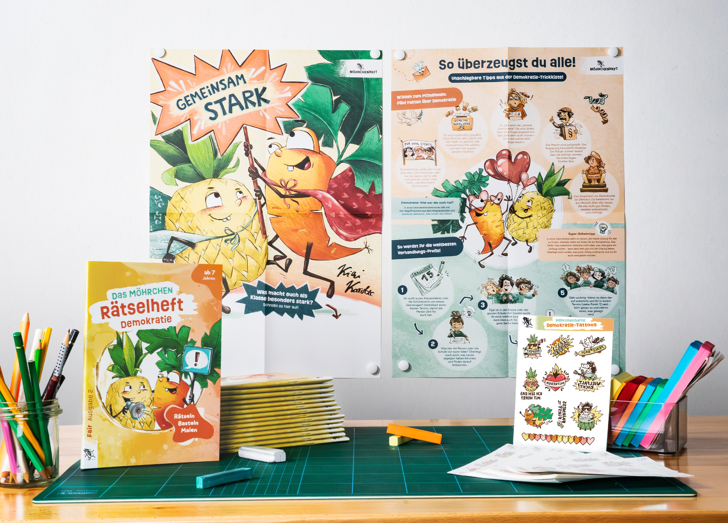Mit dem Möhrchen-Rätselheft Demokratie entdecken Kinder ab 7 Jahren spielerisch, was Mitbestimmung bedeutet. Gemeinsam mit Kiki Karotte und Akki Ananas lernen sie, wie Entscheidungen entstehen, warum Regeln wichtig sind – und dass unterschiedliche Meinungen dazugehören.Das Themen-Paket lädt zum Rätseln, Gestalten und Mitmachen ein und macht Demokratie im Alltag erlebbar. Nachhaltig produziert, liebevoll illustriert und ideal für den Schuleinsatz.Im Paket enthalten
