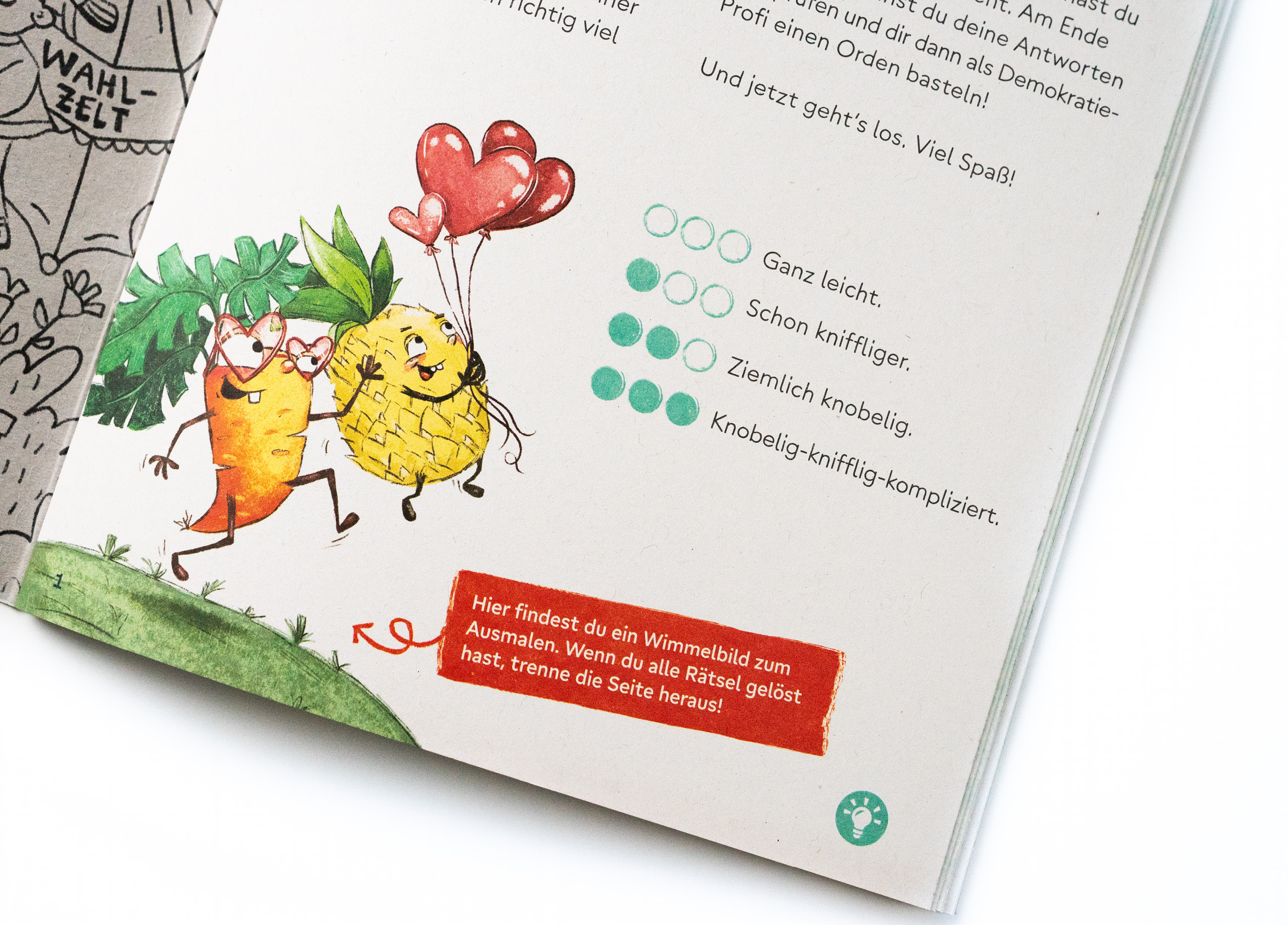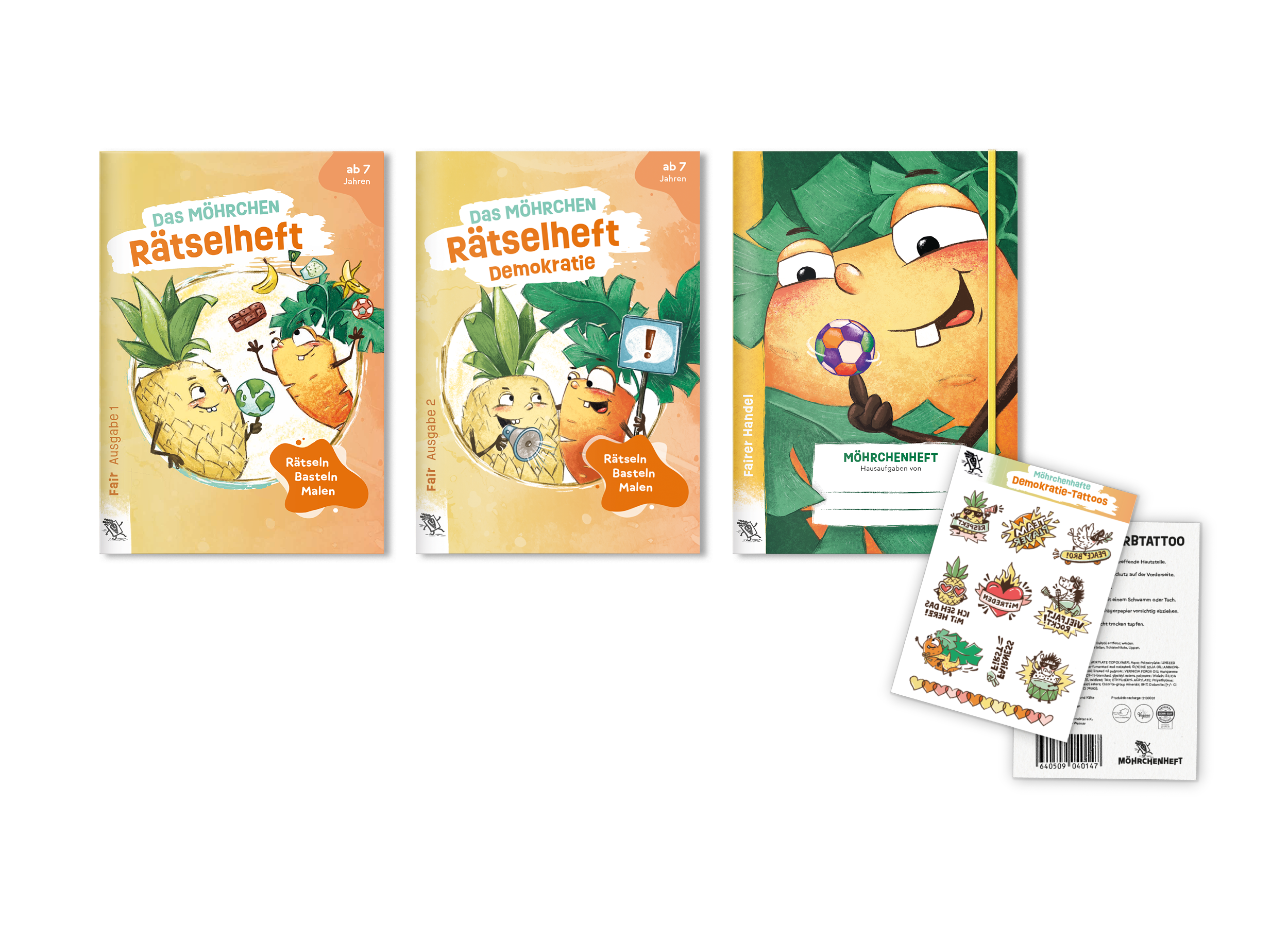 Mit dem Schulstart-Set Fair & Demokratie entdecken Kinder ab 7 Jahren spielerisch, was Mitbestimmung, Gerechtigkeit und fairer Handel bedeuten. Zwei liebevoll gestaltete Rätselhefte – zu den Themen Demokratie und Fair – laden zum Basteln, Malen, Rätseln und Mitmachen ein. Gemeinsam mit Kiki Karotte und Akki Ananas lernen Kinder, wie Entscheidungen entstehen, warum Regeln wichtig sind und was fairer Handel im Alltag bedeutet.