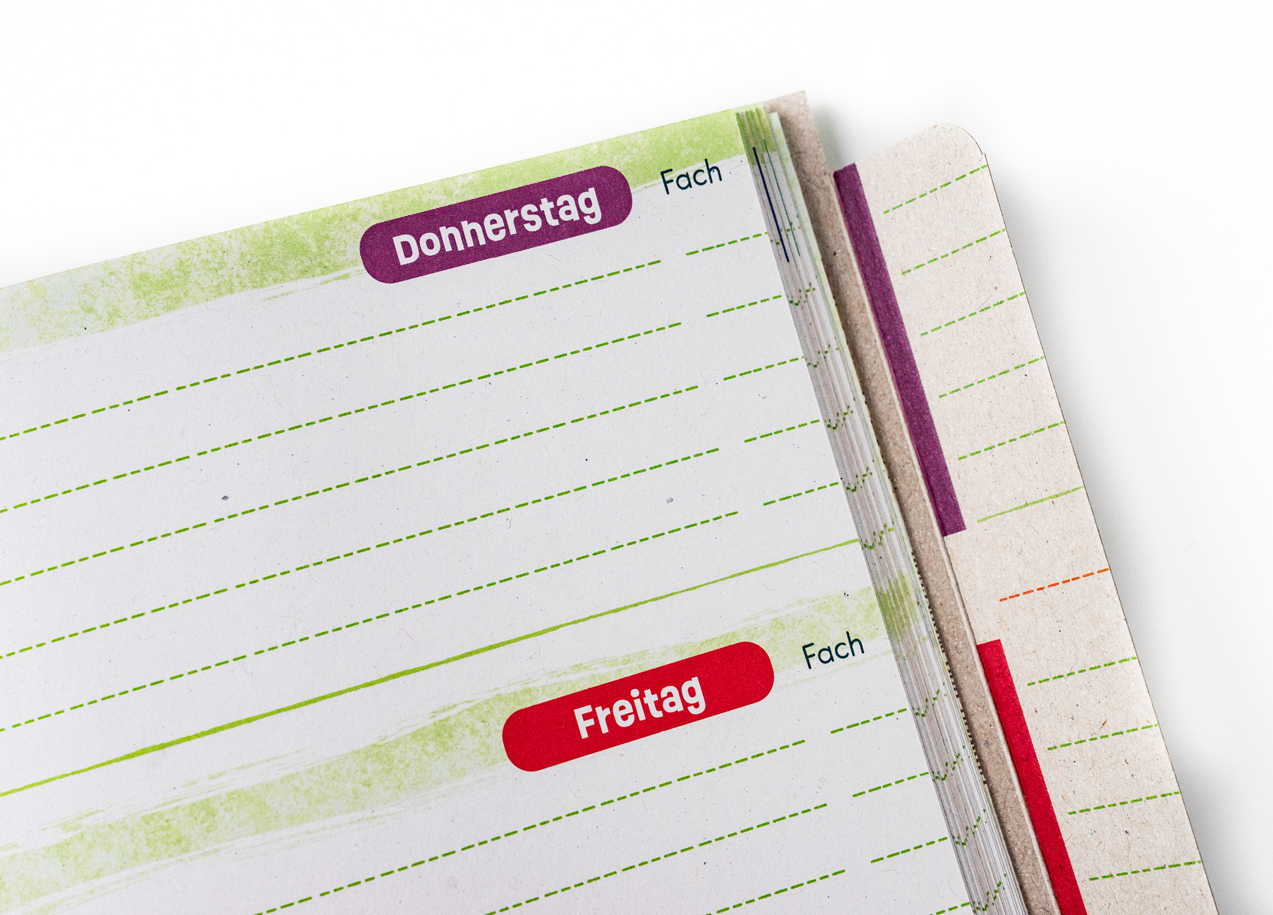 - Seitenleiste für Stundenpläne und Gummiband zum Verschließen